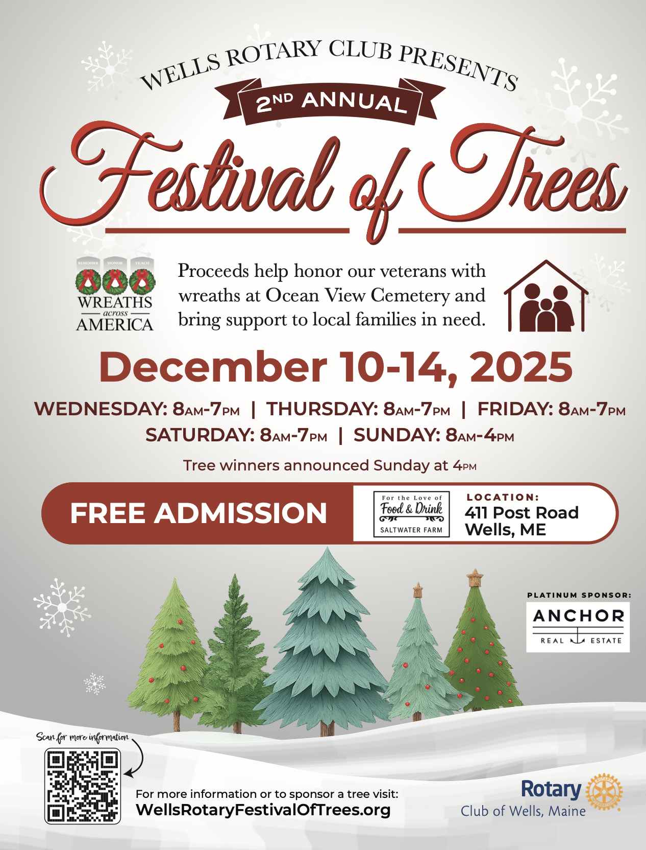 Join the Wells Rotary Club for a heartwarming holiday tradition that brings our community together in the spirit of giving. The Festival of Trees transforms For the Love of Food + Drink at Saltwater Farm into a winter wonderland filled with beautifully decorated trees, festive cheer, and opportunities to give back. Proceeds from the event support Wreaths Across America at Ocean View Cemetery and help local families in need — spreading joy and kindness throughout Wells and beyond.